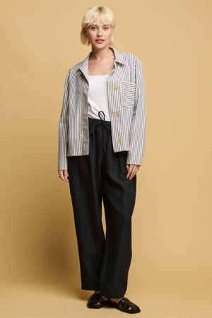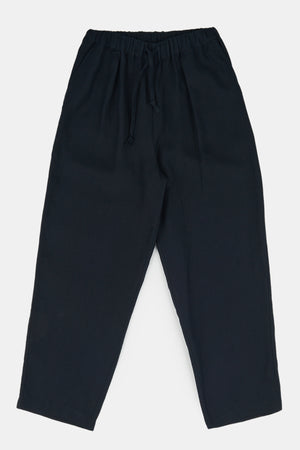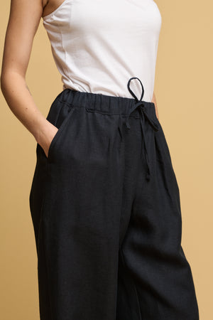 Pleated linen trousers with tapered leg and adjustable drawstring waist, two front and two jet back pockets.