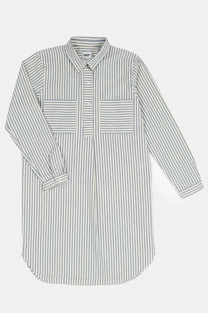 Half placket 3 button shirt dress, long sleeves with single button cuff, curved hem and two external chest pockets. Designed to be worn on its own in high summer, or with trousers as a layer in colder months.