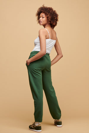 Elasicated waist with heavy cotton drawstring, two side pockets, elasticated ankle