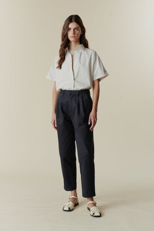 Double front pleats, zip fly and jeans button fastening, two slant side pockets, single rear pocket, jeans construction with chain stitched hem and felled seams