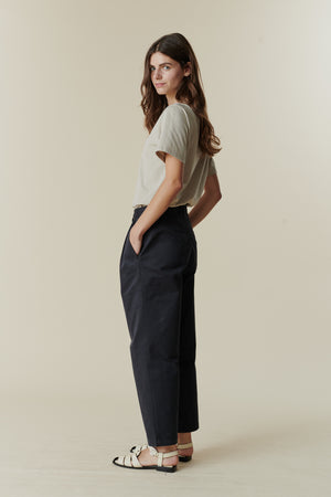 Wide tapered leg, high rise waistline. Maya is 5'11'' wearing 8
