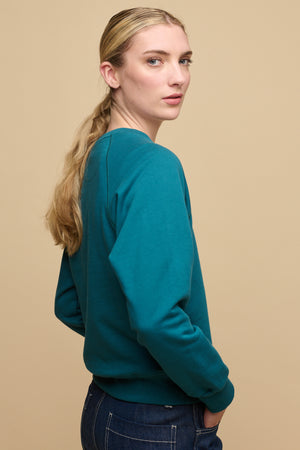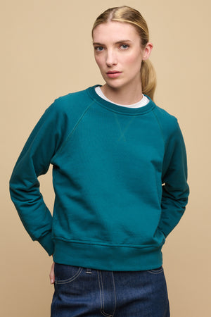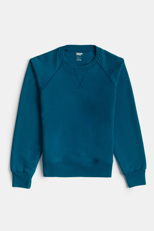 Crew neck, raglan sleeve. Rib cuff, waist and neck