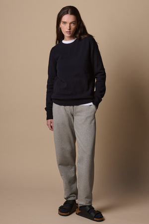 Medium weight 335g 100% organic cotton loopback jersey. 100% cotton drawstring. Fabric knitted and dyed in Leicester.