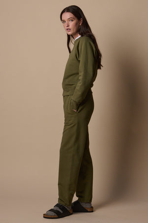 Medium weight 335g 100% organic cotton loopback jersey. 100% cotton drawstring. Fabric knitted and dyed in Leicester.