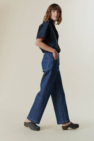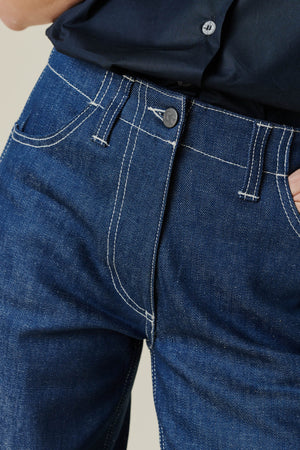 14oz denim, 46% cotton, 40% recycled cotton, 13% recycled polyester, 1% elastane