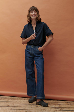 High waist, wide leg, flat front. Slant side pockets, two rear pockets. Zip fly, button fastening at waist.