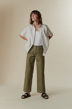 High waist, wide leg, flat front, slant side pockets, two rear pockets, zip fly, button fastening at waist