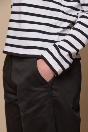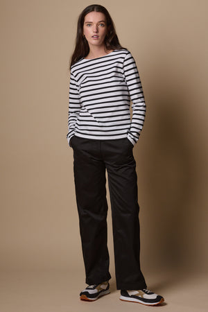Flat front, wide leg, slant side pockets, two rear pockets, zip fly, button fastening at waist